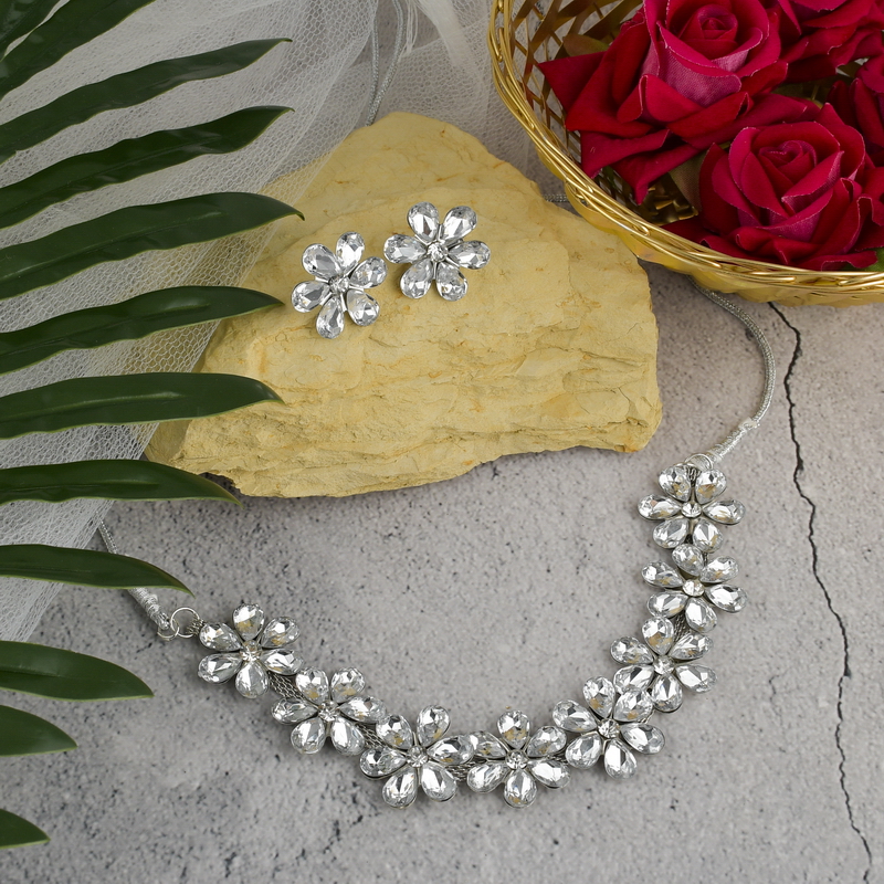 Designed with premium-quality clear crystals arranged in delicate flower patterns, this necklace set delivers a refined diamond-look sparkle that enhances your outfit effortlessly.